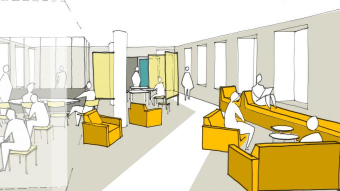 - L’ENA réinterroge certains de ses locaux pour les adapter à de nouvelles formes de travail et d’enseignements. Ainsi, il est envisagé de créer un espace ouvert de travail collaboratif permettant aux élèves et aux enseignants de développer des projets communs et individuels. Le secteur ainsi réaménagé est positionné dans une zone de passage reliant les deux halls de l’Ecole : le hall d’accueil et de contrôle et le hall d’honneur. L’enjeu est de profiter du flux pour agréger des espaces de détente et de convivialité tout en y associant travail individuel et espaces collectifs. Chaque espace bénéficie de la souplesse d’organisation et de l’intimité dont il a besoin.
