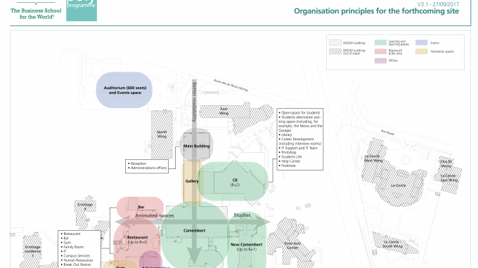 L’INSEAD doit restructurer son campus historique qui reste, malgré ses faiblesses actuelles, celui qui est le plus apprécié de tous les sites INSEAD (Singapour, Abu Dhabi). Ce vaste projet vise à proposer une image renouvelée du site, à remédier à certaines obsolescences techniques et fonctionnelles, à créer de nouveaux outils en adéquation avec les besoins et attentes des étudiants.Les sujets les plus prégnants concernent l’entrée, le bâtiment des amphithéâtres, la restauration, l’insuffisance de bor’s (Break out rooms) et plus généralement d’espaces de travail libre pour les étudiants.